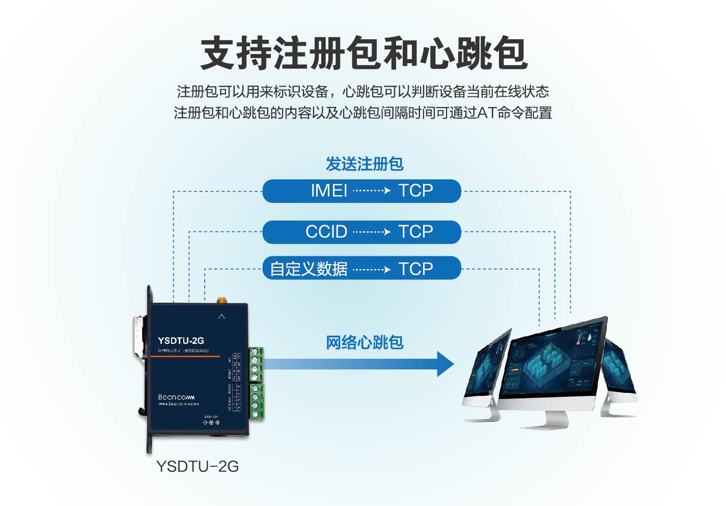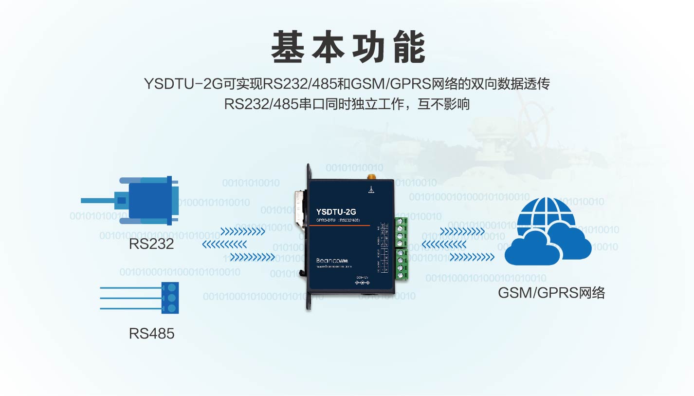 YSDTU-2G是一款GSM/GPRS的导轨式DTU设备,采用RS485,RS232接口与设备通信,实现了串口到网络的双向数据透明传输,同时支持一路电源输出 可直接给外接设备供电。YSDTU-2G支持移动、联通、电信2G接入,为用户设备提供稳定可靠的联网功能。支持TCP,UDP,HTTP等协议,已内嵌的扩展AT命令可以使用户更容易修改配置。YSDTU-2G支持远程升级。