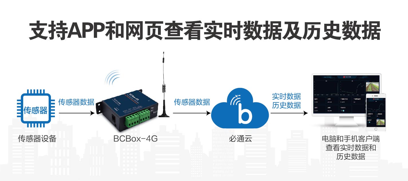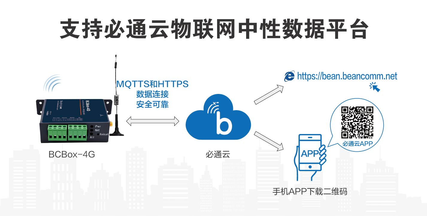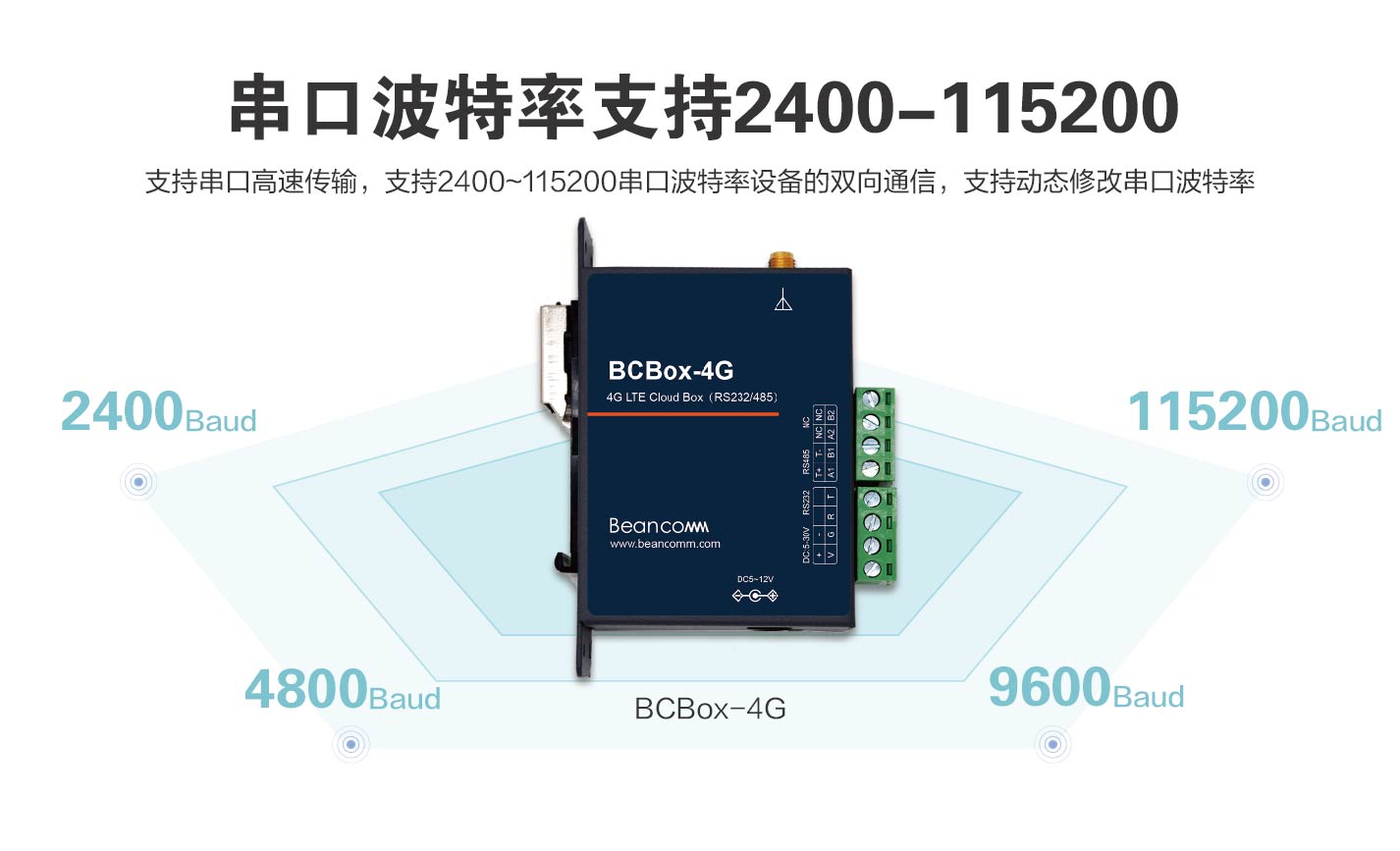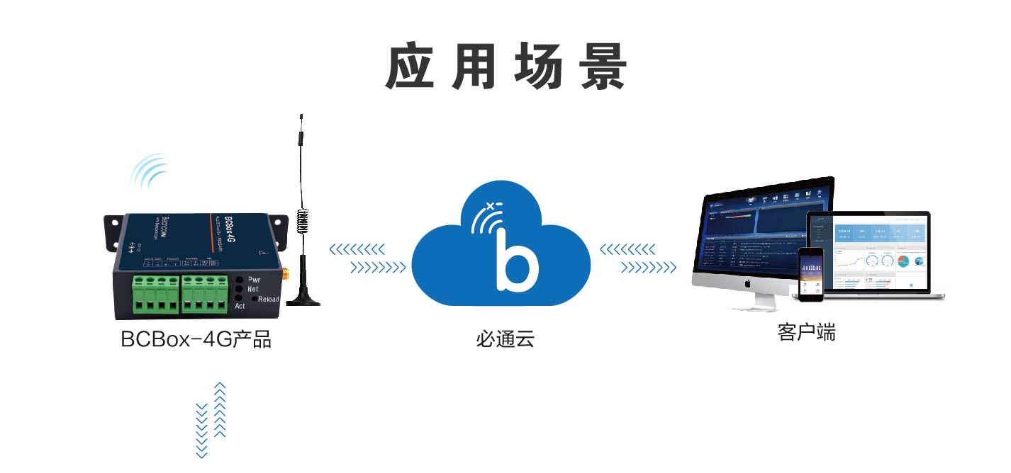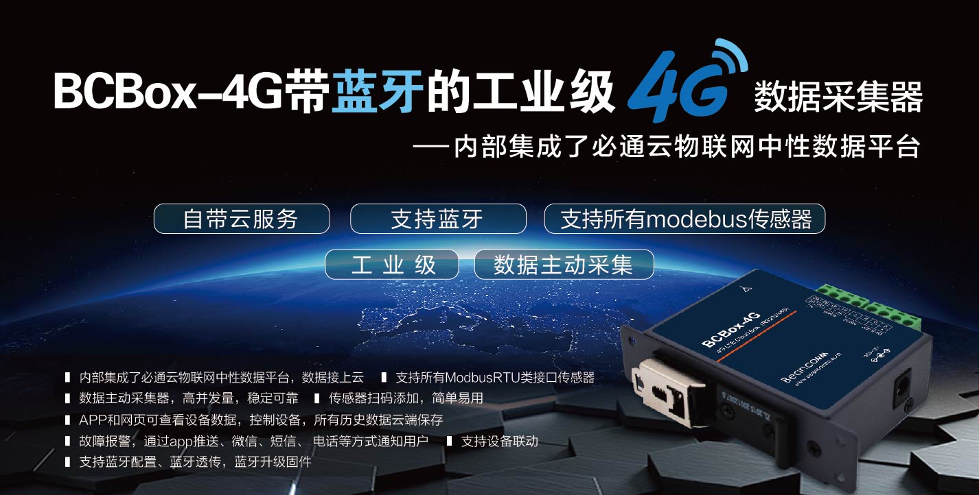 BCBox-4G是一款4G的导轨式DTU设备,采用RS485,RS232接口与设备通信,实现了串口到网络的双向数据透明传输,同时支持一路电源输出,可直接给外接设备供电。BCBox-4G支持移动、联通、电信4G/3G/2G接入,工作在4G网络时具有速度快、延时低的特点,适用于需要传输大数据量、响应及时的场景。 BCBox-4G使用简单,可以通过蓝牙动态配置工作参数、查询工作状态,省去额外接线,方便用户安装调试。 BCBox-4G内部集成了必通云物联网中性云平台,支持采集所有ModbusRTU类传感器以及其他设备。必通云云端创建设备模型下发到BCBox-4G,通过网页添加或者手机扫码添加之后,BCBox-4G即可主动采集数据,一个BCBox-4G设备可以同时采集多个设备,支持网页客户端和手机端服务,可以在网页或者手机端查看设备数据以及控制设备,完成对设备的采集监控。同时,必通云支持触发报警功能,当设备出现异常时将通过app推送、微信、短信、 电话等方式通知用户,方便用户及时管理和维护设备。另外,BCBox-4G支持远程升级。
