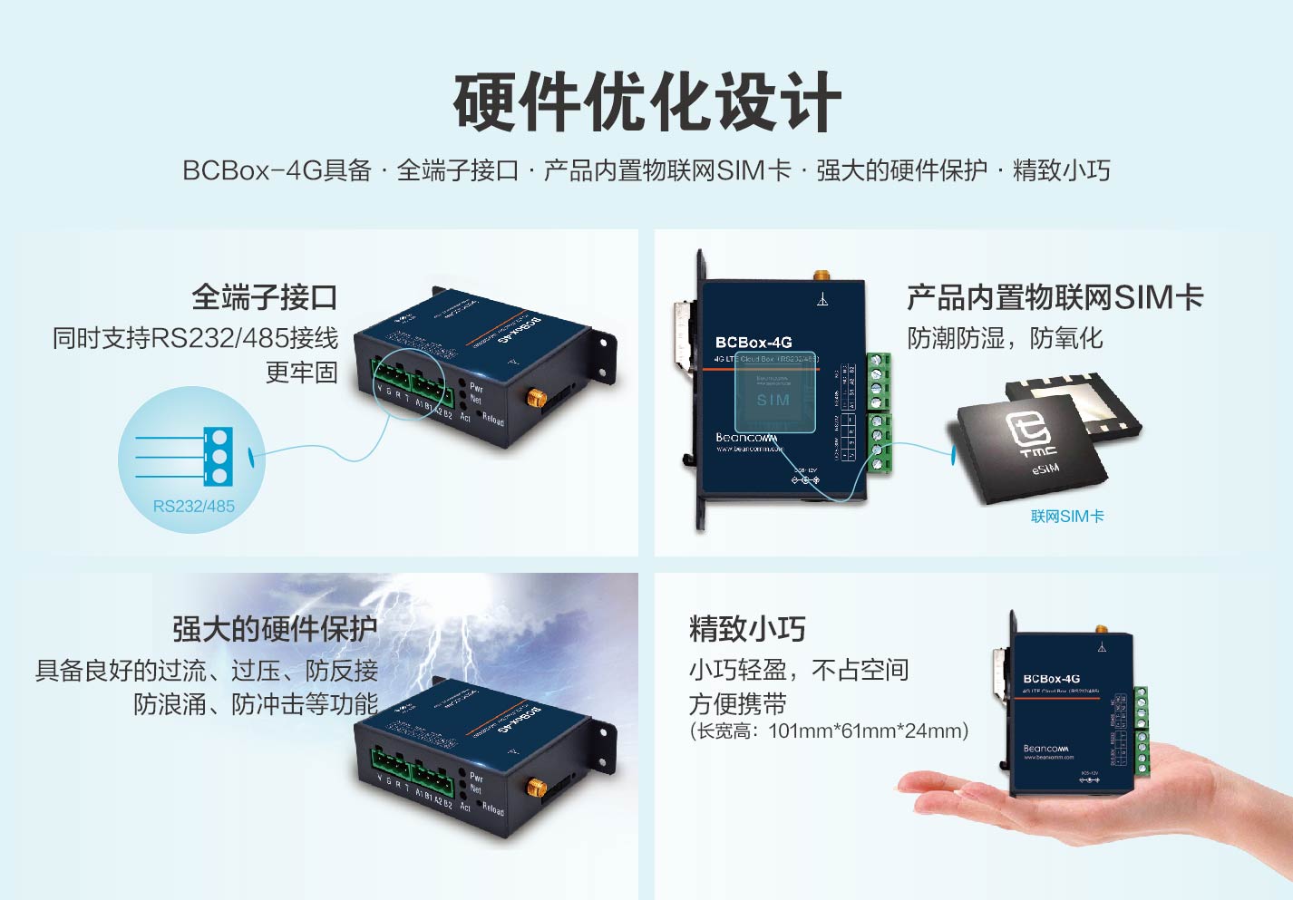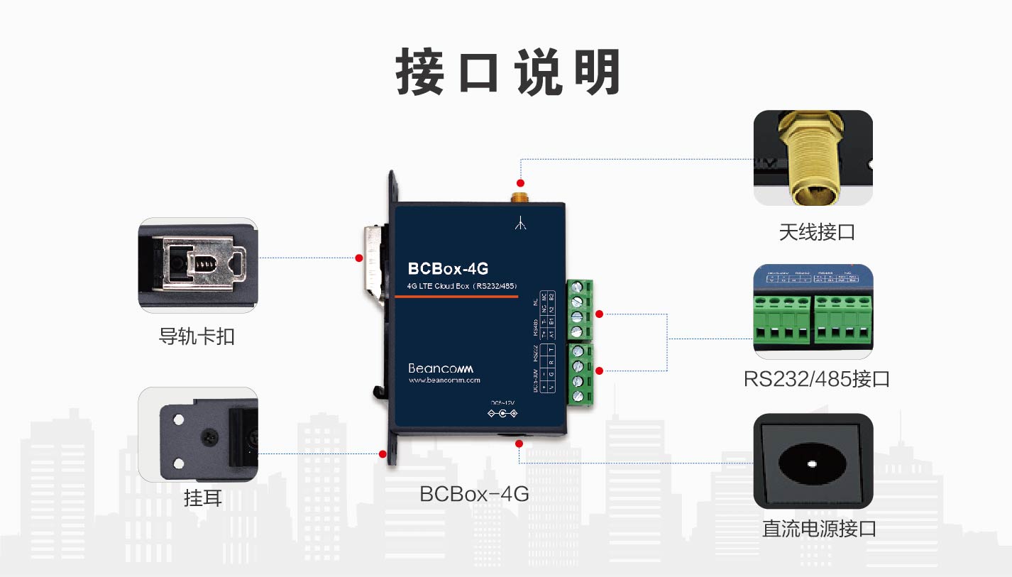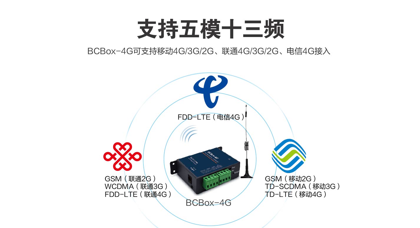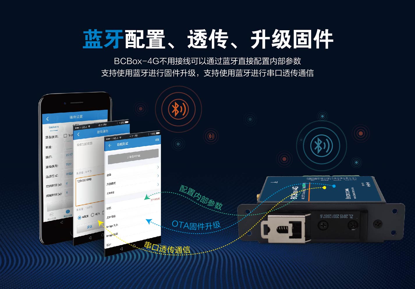 BCBox-4G是一款4G的导轨式DTU设备,采用RS485,RS232接口与设备通信,实现了串口到网络的双向数据透明传输,同时支持一路电源输出,可直接给外接设备供电。BCBox-4G支持移动、联通、电信4G/3G/2G接入,工作在4G网络时具有速度快、延时低的特点,适用于需要传输大数据量、响应及时的场景。 BCBox-4G使用简单,可以通过蓝牙动态配置工作参数、查询工作状态,省去额外接线,方便用户安装调试。 BCBox-4G内部集成了必通云物联网中性云平台,支持采集所有ModbusRTU类传感器以及其他设备。必通云云端创建设备模型下发到BCBox-4G,通过网页添加或者手机扫码添加之后,BCBox-4G即可主动采集数据,一个BCBox-4G设备可以同时采集多个设备,支持网页客户端和手机端服务,可以在网页或者手机端查看设备数据以及控制设备,完成对设备的采集监控。同时,必通云支持触发报警功能,当设备出现异常时将通过app推送、微信、短信、 电话等方式通知用户,方便用户及时管理和维护设备。另外,BCBox-4G支持远程升级。