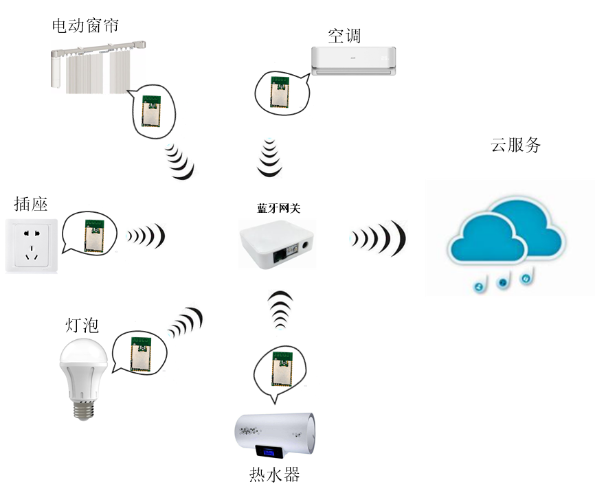 Mesh组网可以实现数据网关对蓝牙节点的管理,可以应用在智能家居,传感器网络,等等场景下,可以参考下图应用场景。